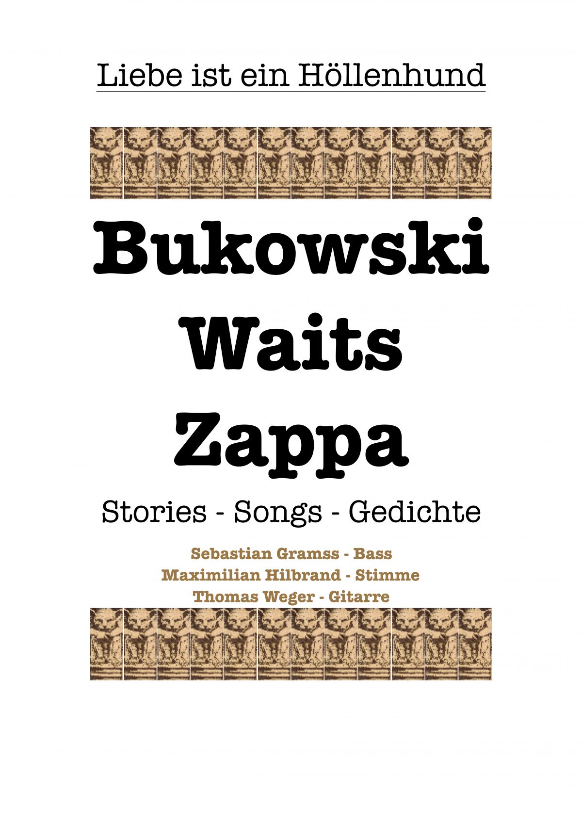 CHARLES BUKOWSKI “ Bedeutendster Dichter seiner Generation – exzellenter Beobachter – brutaler Romantiker – absurder Komiker – ewiger Außenseiter „ „LIEBE IST EIN HÖLLENHUND“ Ein grandioser Abend über :Bier – Pferde – Männer – Frauen – Geld – Sex – Bars – zahnlose Hunde – traurige Engel – kleine braune Kerle – Gangster – Puppen – Cops und Hollywood Songs …